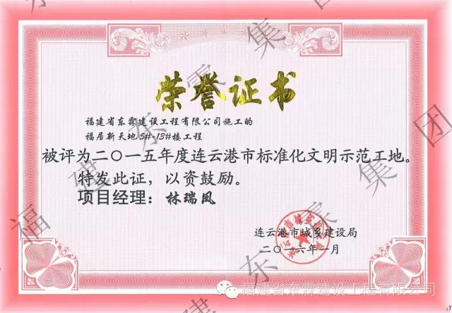 福居新天地5#-13#楼工程被连云港市城乡建设局评为2015年度“连云港市标准化文明示范工地”