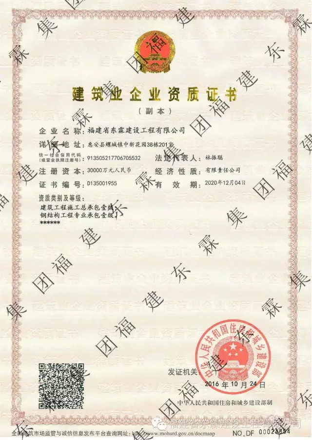 2016年10月21日住房城乡建设部关于核准2016年度第十二批建设工程企业资质资格名单的公告中福建省东霖建设工程有限公司钢结构工程专业承包晋升壹级资质。