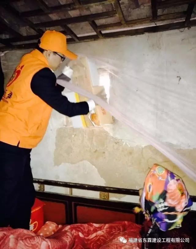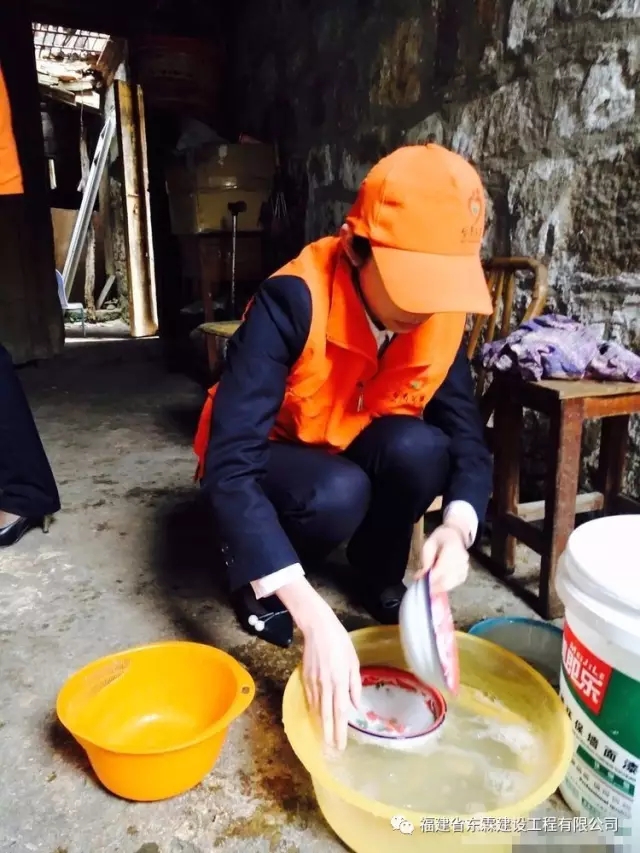 福建东霖建设工程集团行政部林红梅为老人家桌子简单收拾整理,行政部黄冰冰帮大娘清洗了碗和家具,质安部吴楚焜把老人家里一个破坏的窗户进行简单修复。