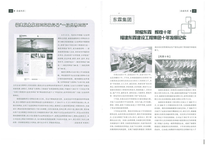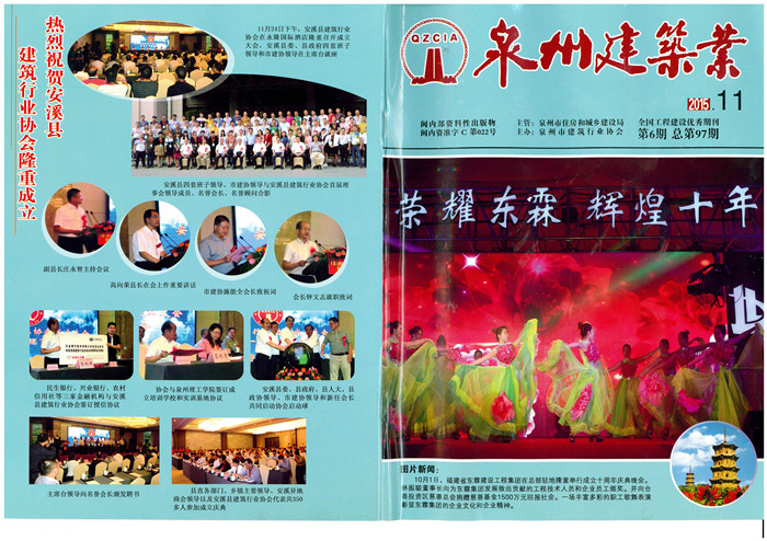 泉州市建筑业协会主办的泉州建筑业期刊于2015.11第6期主题刊登了福建省东霖建设工程有限公司成立十周年庆典活动,并对福建东霖建设工程集团十年发展纪实进行宣传。