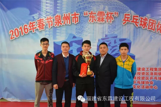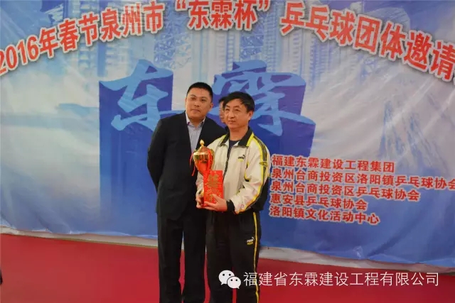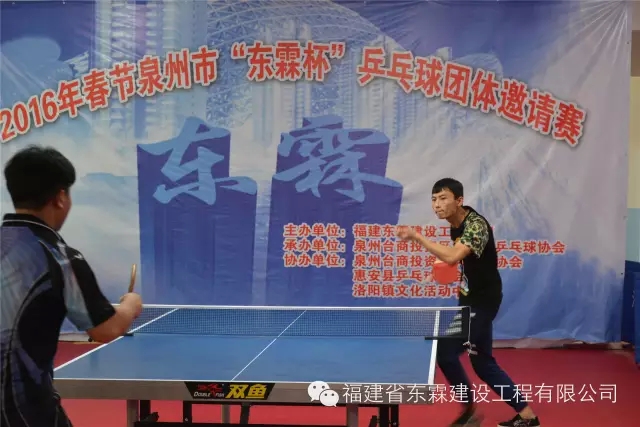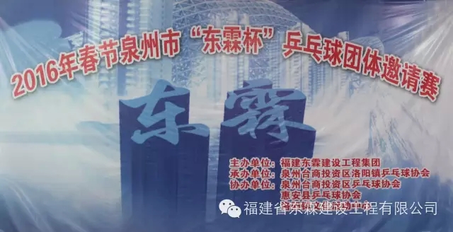 由福建东霖建设工程集团主办,泉州台商投资区洛阳镇乒乓球协会承办,泉州台商投资区乒乓球协会、惠安县乒乓球协会、洛阳文化活动中心等3单位协办的2016年春节泉州市“东霖杯”乒乓球团体邀请赛,于2016年2月12日(农历正月初五)在泉州台商投资区洛阳镇乒乓球训练馆隆重举行。